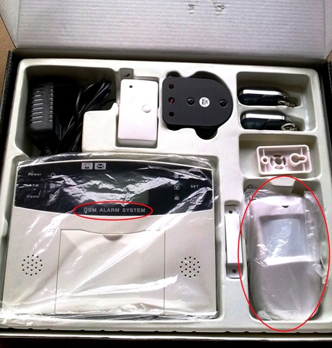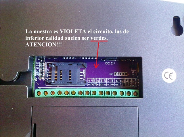 En las siguientes imágenes se observan detalles para identificar a los equipos que podrían ser de inferior calidad: el circuito impreso es de color verde en lugar de violeta, en el frente suelen poner GSM ALARM SYSTEM e incluye un sensor PIR como el que se muestra .